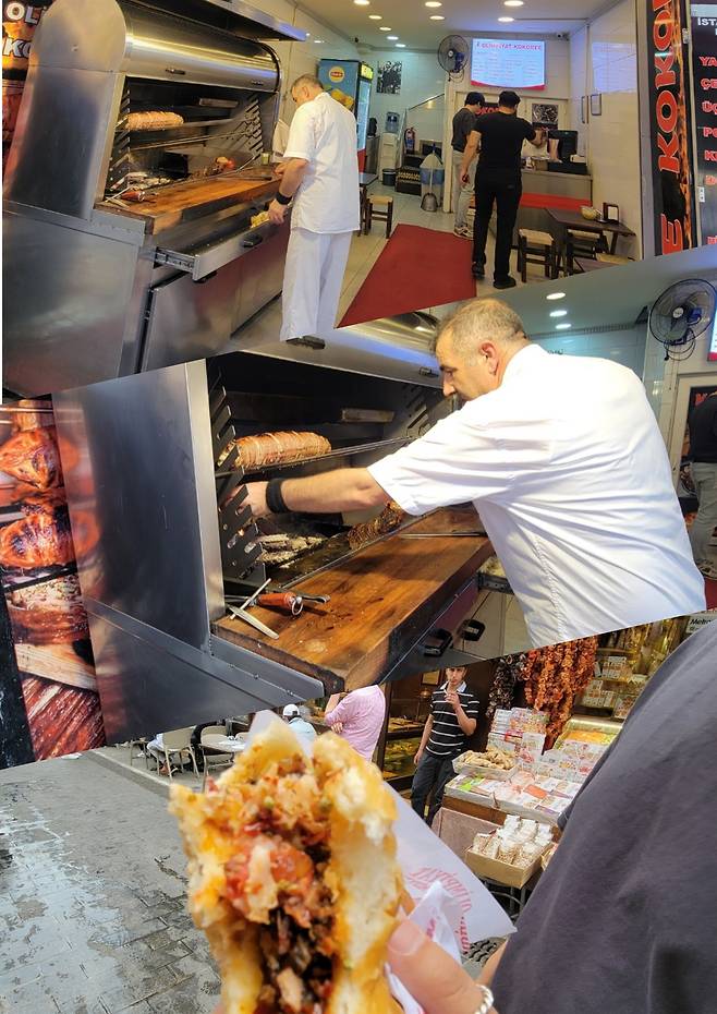 코코레치는 튀르키예의 전통 길거리 음식으로, 어린양이나 소의 곱창(창자부위)을 양념에 재운 후 꼬치에 감아 구워내고, 그것을 잘게 썰어 빵에 넣어 먹는 방식이다. 우리가 찾은 식당에서는 대형 그릴에 곱창을 굽고 있었고, 그것을 바삭하게 구운 후 접시에 샌드위치처럼 담아냈다. 이것을 한국말로 곱창 케밥이라 불렀다.