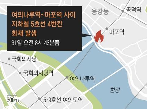이번 화재로 서울 지하철 5호선 하행선 여의도역~애오개역 구간의 운행이 1시간 30분가량 중단되기도 했다.