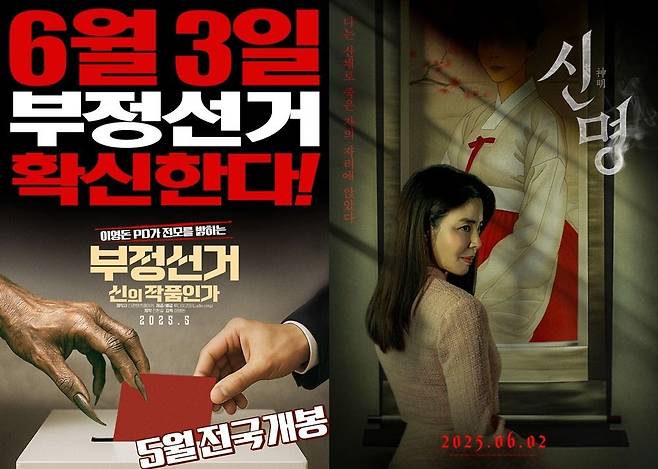 이외에도 6월 2일 오컬트 정치 영화 '신명'이 개봉한다. '신명'은 신비로운 힘을 이용해 권력을 쥐려는 한 여인과, 숨겨진 진실을 파헤치는 기자의 치열한 싸움을 담았다. 예고편이 공개된 후 온라인상에서는 김규리가 맡은 캐릭터 윤지희가 윤석열 전 대통령의 배우자 김건희를 연상시킨다며 화제를 모으기도 했다.