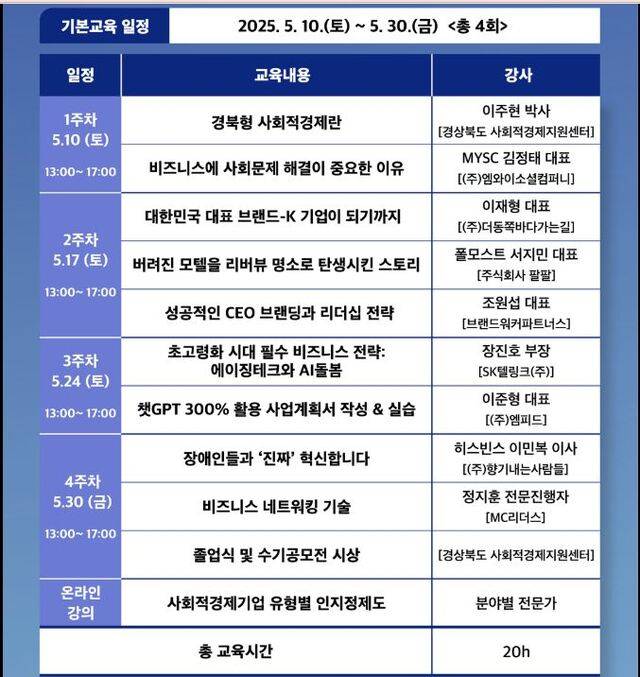 이번 교육은 1주차에 이주헌 경북도 사회적경제지원센터 박사가 '경북형 사회적경제란'을 주제로 전반적인 사업에 대한 정책적 지원과 상세한 사업에 대한 설명을 갖고, MYSC(엠와이소셜컴퍼니) 김정태 대표가 '비즈니스에 사회문제 해결이 중요한 이유'에 대해서 강의를 가졌다.