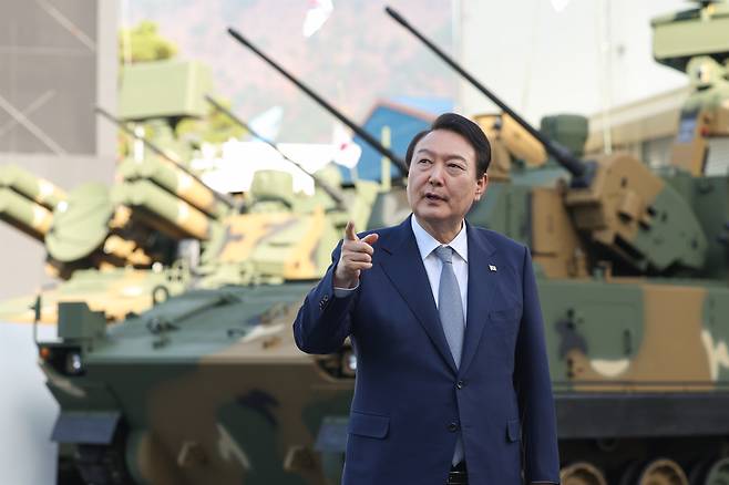 | ▲ 2022년 11월 24일 당시 윤석열 대통령이 경남 창원시 한화에어로스페이스를 방문해 전시 장비를 둘러보며 대화하고 있다. |