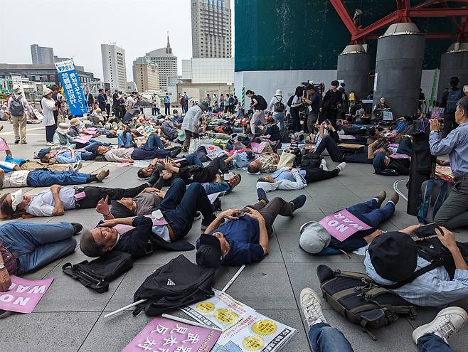 | ▲ 지난 21일~23일 지바현 마쿠하리 멧세에서 열린 무기박람회 DSEI에 항의하기 위해 행사장 바깥에서 다이인 퍼포먼스를 펼치는 일본 시민들 |