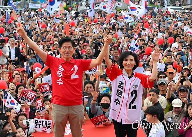 | ▲ 김문수 국민의힘 대선 후보와 배우자 설난영 여사가 22일 오후 경기도 부천역 광장에서 열린 “김문수를 키운 부천” 집중유세에서 시민들에게 지지를 호소하고 있다. |