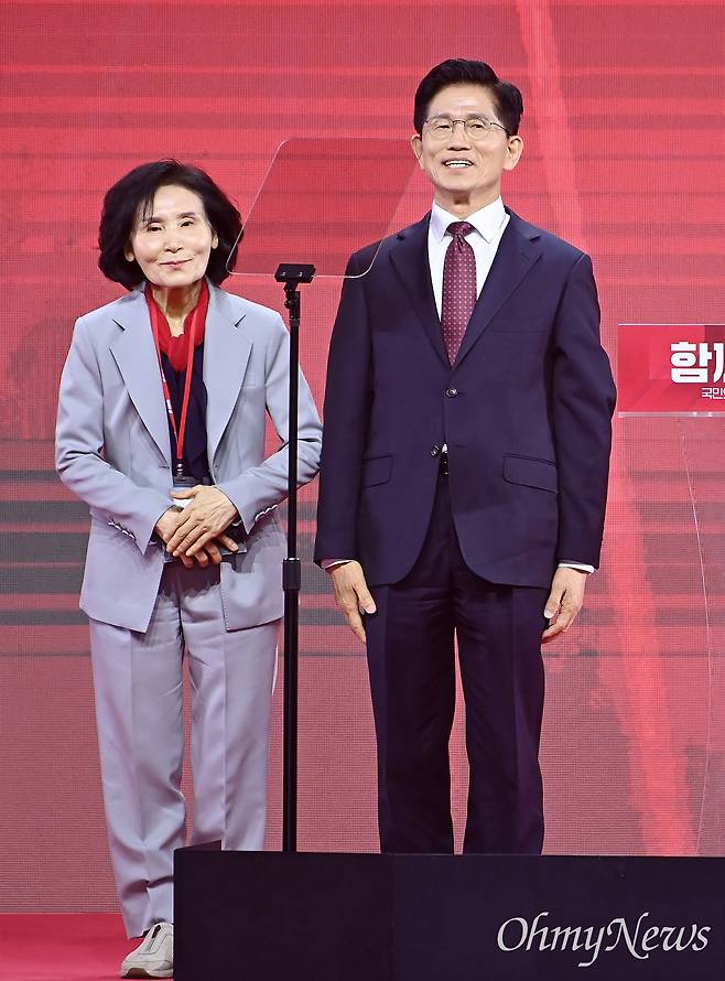 | ▲ 국민의힘 대선 후보로 선출된 김문수 후보가 3일 경기 고양시 킨텍스에서 열린 국민의힘 전당대회에서 배우자 설난영 여사를 소개하고 있다. |