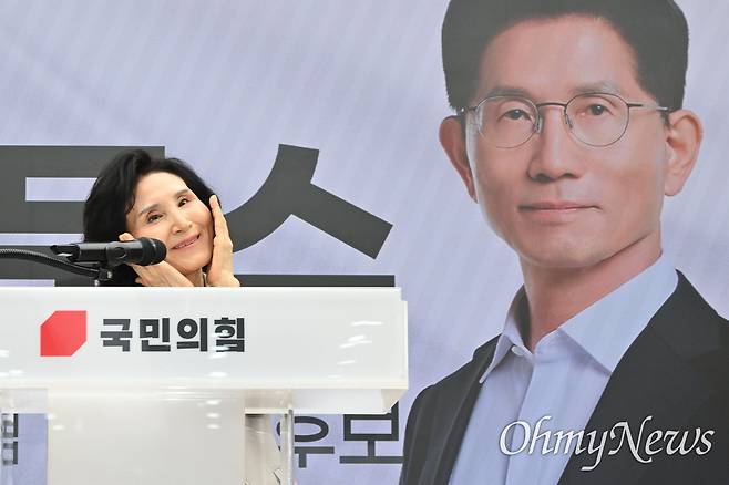 | ▲ '제 실물이 더 낫지요' 다양한 포즈 취하는 김문수 후보 부인 국민의힘 김문수 대선후보 부인 설난영 여사가 21일 서울 여의도 중앙당사에서 열린 함께 하는 정정당당 여성본부 필승결의대회에서 축사 시작 전 소개를 받은 후 손으로 다양한 포즈를 취하고 있다. 이후 설난영 여사는 자신의 결혼식 사진이 실린 국민의힘 부부의날 홍보물을 보여준 뒤 "제 실물이 더 낫지요. 아니 못난이 사진만 여기다 해놨어. 아 정말. 제가 제일 못났다고 생각하는 사진을 여기다 이렇게... 아 정말 너무해요"라고 말했다. |