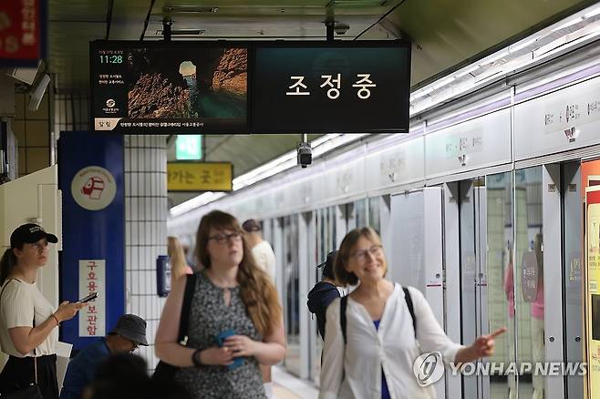 (서울=연합뉴스) 임화영 기자 = 31일 방화로 인해 열차 운행이 한때 중지된 서울 지하철 5호선 마포역이 2시간만에 정상 운행했지만 열차 정보 모니터는 여전히 조정 준비하는 모습을 보이고 있다.