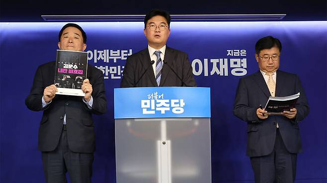 ▲ 13일 서울 여의도 더불어민주당사에서 열린 중앙선거대책위원회 신속대응단 기자회견에서 강득구 단장(왼쪽), 정준호 부단장(가운데), 박관천 부단장이 국민의힘 김문수 후보 내란비호집 관련 브리핑을 하고 있다.