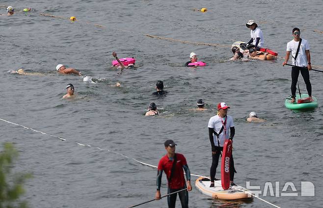 [서울=뉴시스] 조수정 기자 = 31일 오전 서울 뚝섬한강공원에서 열린 제2회 쉬엄쉬엄 한강 3종축제에서 참가자들이 수영 종목에 도전하고 있다. 2025.05.31. chocrystal@newsis.com