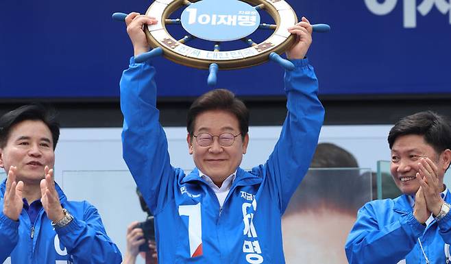 ▲ 더불어민주당 이재명 대선 후보가 선거를 사흘 앞둔 마지막 주말인 31일 경기 평택시 배다리생태공원에서 열린 평택·오산·안성시 유세에서 조타기를 받아 들어올리고 있다.