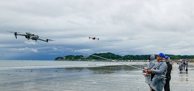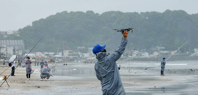 日 자이모쿠자 해변서 힘차게 날아오르다…'세계드론낚시대회 in Japan' [한강로 사진관]