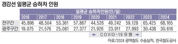 실제 경강선의 광주구간 일평균 승하차인원은 2016년 1만9천여명에서 2018년 2만5천명을 돌파한뒤 지난해 3만616명으로 증가했다. 최근 4년간 이용객이 연평균 11.4%씩 늘어나고 있다. 경강선은 이제 광주·이천·여주시민들의 수도권 도심으로의 출퇴근을 위한 대표 광역 교통수단으로 자리매김한 상황이다.