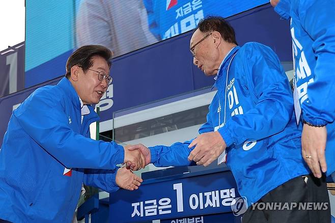 (세종=연합뉴스) 김주성 기자 = 더불어민주당 이재명 대선 후보가 선거를 사흘 앞둔 31일 세종특별자치시 나무그늘광장에서 열린 유세에서 이해찬 전 총리와 악수하고 있다. 2025.5.31