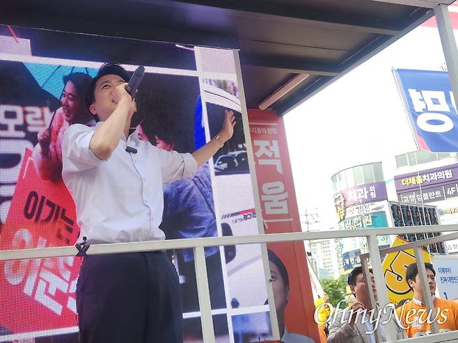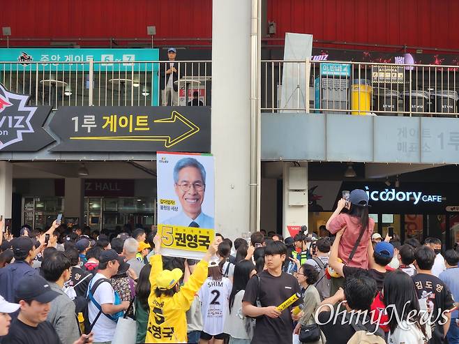 | ▲ 민주노동당은 31일 오후 이준석 개혁신당 대통령 후보가 유세차 방문한 경기도 수원시 수원KT위즈파크 앞에서 '맞불' 홍보를 했다. 사진은 이 후보와 지지자들이 사진 촬영하는 인근에서 '기호 5번 권영국' 후보를 알리는 민주노동당 선거운동원. |