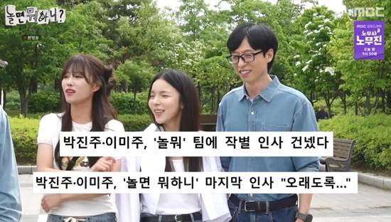 이에 유재석은 "오늘은 너희(박진주, 미주)가 하고 싶은 대로 다 해라"며 하차를 앞둔 이들을 도왔다. 미주는 "됐어. 그만해"라고 외치며 오히려 부담스러운 티를 냈다. 또 유재석은 "오늘은 애들(박진주, 미주) 얘기할 때 리액션으로 뭐라고 하지 마라"고 말했다. 미주는 "그러지 마라. 그냥 평소처럼 해라"고 밝혔다.