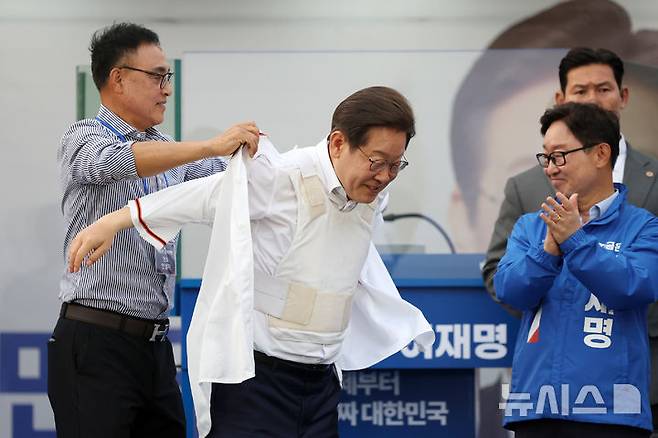 [대전=뉴시스] 조성우 기자 = 이재명 더불어민주당 대선후보가 31일 오후 대전 서구 대전시청 앞 보라매공원에서 열린 유세에서 선거운동복을 벗고 송진우 전 한화이글수 투수가 전달한 유니폼을 입고 있다. 2025.05.31. xconfind@newsis.com