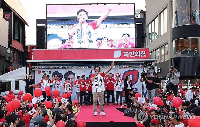 (포항=연합뉴스) 박동주 기자 = 국민의힘 김문수 대선 후보가 31일 경북 포항시 북포항우체국 앞에서 열린 집중유세에서 지지를 호소하고 있다. 2025.5.31