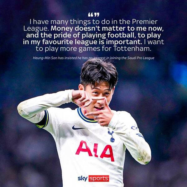 나아가 '더 선'은 "사우디 프로 리그 소속 구단들이 토트넘의 간판스타 손흥민을 노리고 있다. 토트넘도 올여름 그에 대한 거액의 이적료 제안이 들어온다면 매각한다는 입장"이라고 밝혔다.