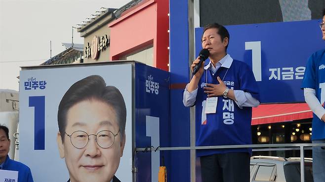 | ▲ 5월 31일 충남 보령 대천해수욕장 노을 광장에서 정청래 의원이 이재명 후보 지지 연설을 하고 있다. |