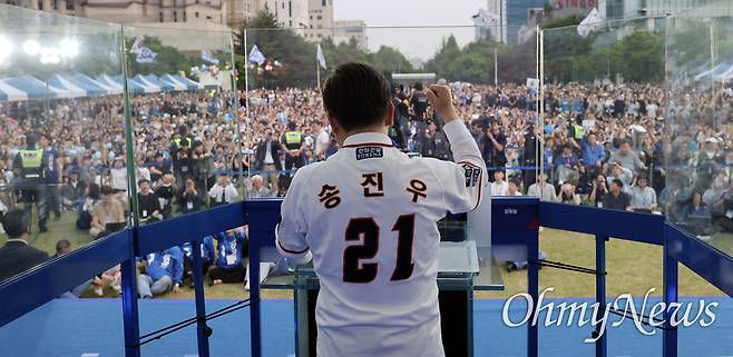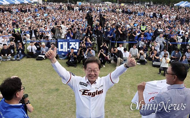 | ▲ 이재명 더불어민주당 대선 후보가 31일 대전시 서구 보라매공원에서 송진우 전 프로야구 한화이글스 선수로부터 받은 유니폼을 입고 지지를 호소하고 있다. |