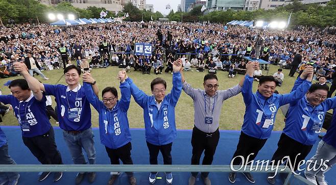 | ▲ 이재명 더불어민주당 대선 후보가 31일 대전시 서구 보라매공원에서 박범계, 장철민, 조승래 의원과 함께 지지를 호소하고 있다. |