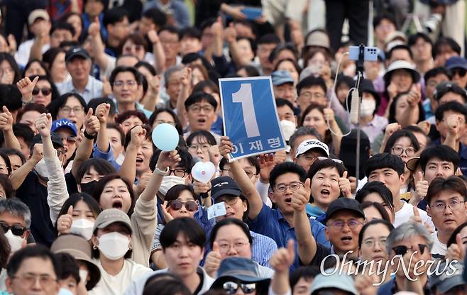 | ▲ 이재명 더불어민주당 대선 후보 지지자들이 31일 대전시 서구 보라매공원에서 열린 이 후보의 유세를 지켜보며 환호하고 있다. |