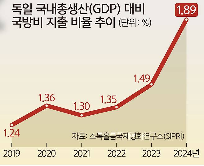 독일이 국방 분야에서 파격적으로 재정 지출을 늘려 온 배경에는 우크라이나 전쟁 이후 고조된 안보 불안, 장기화된 경기 침체라는 이중의 위기 상황이 자리하고 있다. 소련 해체 이후 유럽과 러시아는 비교적 평화로운 관계를 유지해 왔고 독일은 군비 지출을 줄여 복지, 경제 분야에 예산을 투입할 수 있었다. 그러나 러시아의 우크라이나 침공 이후 판이 바뀌었다. 러시아는 독일을 노릴 수 있는 직접적인 군사 위협이 되어 독자적 방위 역량을 키워야 하는 필요성이 증가했다. 게다가 도널드 트럼프 미국 행정부가 북대서양조약기구(NATO·나토)에 방위비 분담을 늘리라는 압박을 높이면서 더 이상 미국에 안보를 기대기만 해서는 안 되는 상황에 직면했다. 마르크 뤼터 나토 사무총장은 지난 15일 나토 회원국이 직접 군사비로 GDP의 3.5%를, 인프라 및 사이버 보안 등 광범위한 안보에 GDP의 1.5%를 할애하는 방안을 제안했다. 요한 바데풀 독일 외무장관은 “트럼프 대통령이 요구했던 5%를 따를 것”이라며 뤼터 사무총장의 제안에 동의했다.