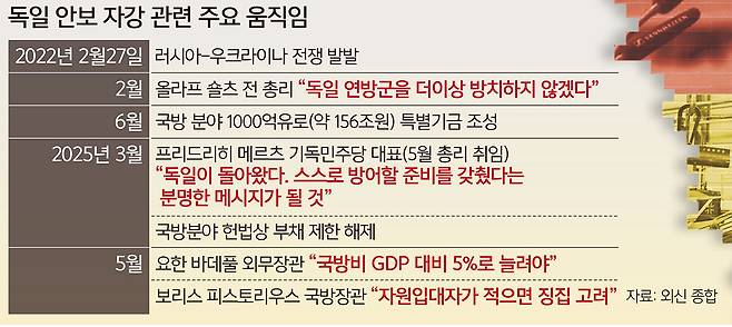 프리드리히 메르츠 독일 총리의 선언은 자국의 안보 자강을 위한 기초를 마련했다는 자신감, 혹은 자부심의 표현이었다. 총리 취임 전 자신의 주도로 정부의 국방 관련 지출을 대폭 늘릴 수 있도록 헌법 개정을 합의한 이후였다. 국방 분야에 대한 정부의 대규모 지출이 시장에 유입되면서 침체된 경제를 되살리는 선순환의 기폭제가 될 것이란 기대도 커지는 상황이다. 방위산업을 발판으로 도약을 노려보는 기업이 많아졌고, 관련 일자리도 증가한 것으로 파악되고 있다.