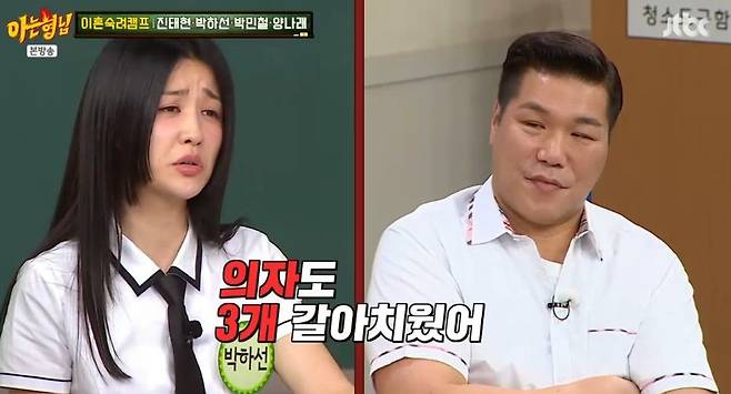 이에 박하선은 "서장훈이 방송에는 화를 내는 모습으로 나오지만 실제로는 엄청 참는다. 서장훈은 남자가 봐도 무서운 거한 아닌가. 그런 서장훈에게 들이 받는 출연자들이 있다. 그걸 다 참는다"라고 말했다. 아울러 "녹화를 하면서 성대 결절이 오고 의자도 3개 정도 갈아치웠다. 자꾸 뒤로 넘어가서 여러 개를 부셨다"며 비하인드도 덧붙였다.