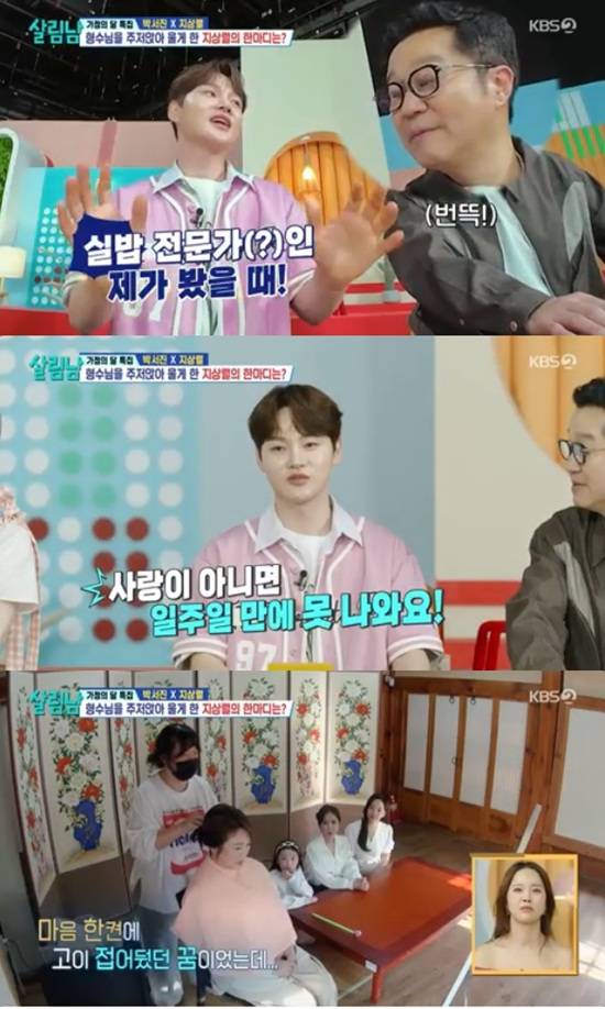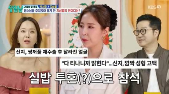 31일 방송된 KBS 2TV '살림하는 남자들 시즌2'에서는 신지가 쌍꺼풀 재수술 이후 첫 일정으로 지상렬 형님 부부의 리마인드 웨딩에 참석하는 모습이 전파를 탔다.