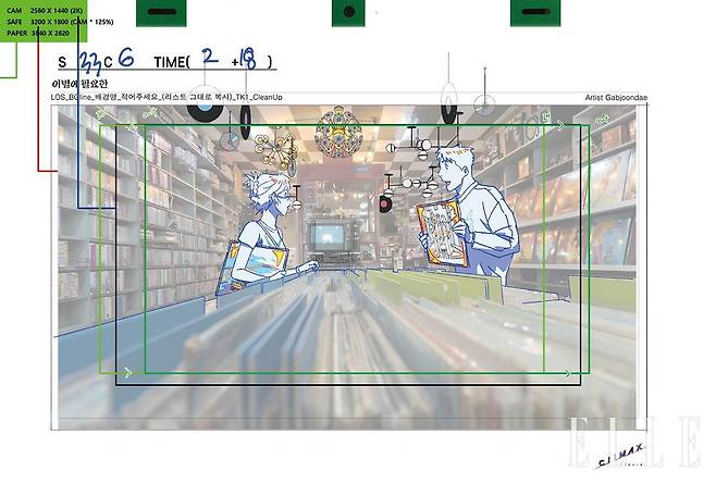 인터뷰 전 미리 보내 준 러프 스케치들을 보니 한강, 성수동 편집 숍, 을지로의 음반 가게 같은 배경이 자연스럽게 등장하더라 상상력을 통해 굉장히 다른 미래를 보여줄 수도 있지만 이번 작품에서는 너무 이질적인 미래를 보여주고 싶지는 않았다. 사실 지금 25년 전을 생각해 보면 고작 2000년도 아닌가. 건축 잡지나 패션 브랜드들이 제시한 미래의 이미지를 참고하면서 공감할 수 있는 미래를 만들고 싶었다.