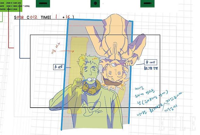 원작이 없다는 것, 성인 애니메이션이라는 것, 2D 토대라는 점에 덧붙여 또 특별한 지점은 실제 배우가 애니메이팅 과정에 참여했다는 것이다. 김태리 배우는 최근 〈엘르〉 인터뷰에서 전문 성우가 아닌 본인이 난영을 연기하는 것에 대한 우려가 있었으나 감독님의 설득이 결정을 내리는 데 영향을 미쳤다고 말한 바 있다 뿌듯하다(웃음). 맞다. 배우들의 연기나 동선을 참고하는 실사 촬영을 진행했다. 사실 실사 영상이 애니메이팅의 레퍼런스로 사용되는 것은 디즈니나 픽사 같은 할리우드 애니메이션에서는 매우 익숙한 시도다. 몇 년 전 넷플릭스 1위를 차지한 애니메이션 〈아케인〉 같은 작품도 실제 액팅 영상을 참고하는 과정을 거쳤다. 훌륭한 배우들과 함께하니까 그들의 섬세하고 폭발적인 연기력을 담고 싶은 마음이 자연스럽게 들더라. 연기 전문가가 아닌 내가 애니메이팅을 상상하기보다 배우들의 액션을 참고하는 편이 무조건 더 좋은 결정이라는 확신이 있었다.