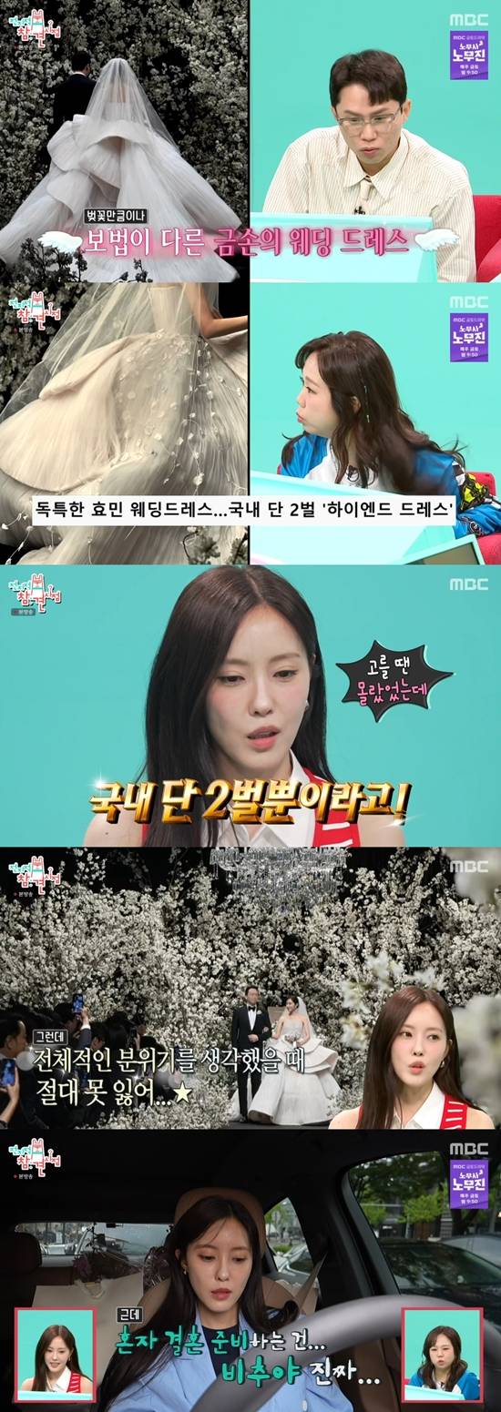 효민은 "고를 땐 몰랐는데 (드레스가) 국내에 두 벌 있다고 들었다. 호불호가 있을 것 같은 느낌은 있었다. 식장 전체를 봤을 때 작품 같아서 포기가 안 됐다"며 기억을 회상했다.