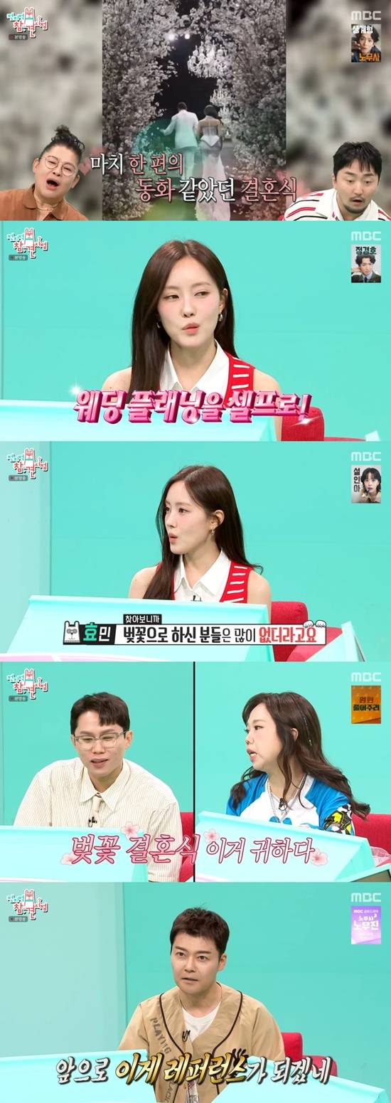 효민은 "웨딩 플래닝을 셀프로 했다. 꽃은 벚꽃으로 (결혼식 장식을) 많이 안 하더라. 시안도 많이 없었다"고 밝혔다. 전현무는 "이게 (효민 결혼식이) 레퍼런스가 될 것 같다"고 말했다.