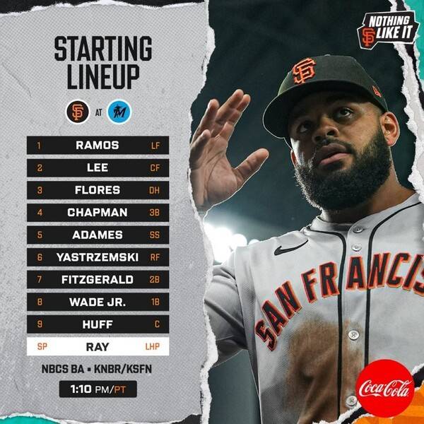 샌프란시스코는 1일 미국 플로리다주 마이애미 론디포파크에서에서 열리는 2025 메이저리그(MLB) 정규시즌 마이애미 말린스와 원정경기를 앞두고 선발 라인업을 발표했다.
