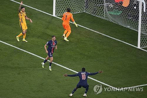 PSG's Achraf Hakimi, center, celebrates after scoring the opening goal against Inter Milan during the Champions League final soccer match between Paris Saint-Germain and Inter Milan at the Allianz Arena in Munich, Germany, Saturday, May 31, 2025. (AP Photo/Michael Probst)