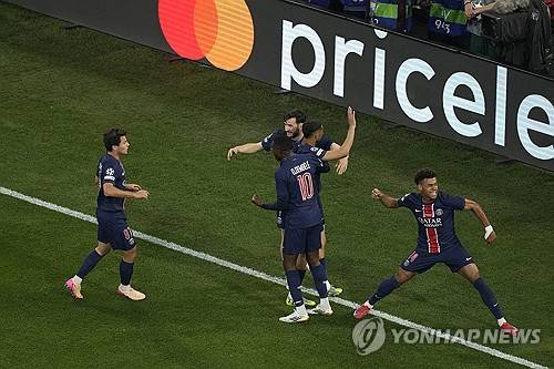 PSG's Achraf Hakimi, center, celebrates after scoring the opening goal against Inter Milan during the Champions League final soccer match between Paris Saint-Germain and Inter Milan at the Allianz Arena in Munich, Germany, Saturday, May 31, 2025. (AP Photo/Michael Probst)