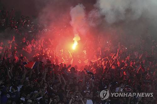 Supporter celebrate PSG's opening goal during the the Champions League final soccer match between Paris Saint-Germain and Inter Milan, Saturday, May 31, 2025 at the Parc des Princes stadium in Paris. (AP Photo/Michel Euler)