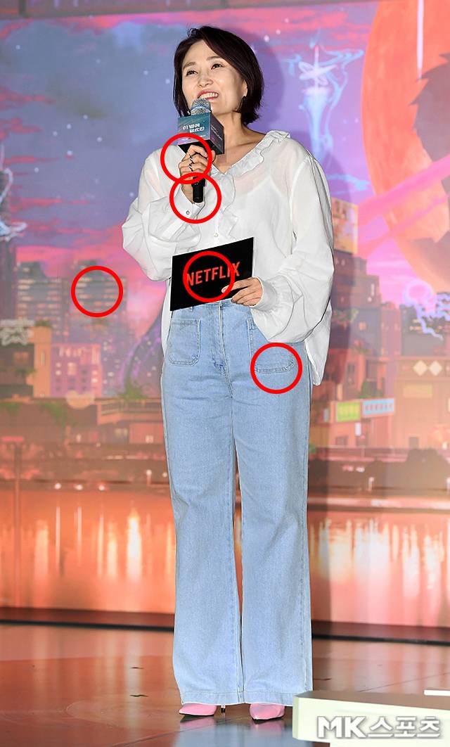 이날 시사회에서 박경림은 시스루 프릴 블라우스와 주머니 모양이 독특한 연청 와이드 데님 팬츠를 매치해 산뜻한 여름 감성 스타일링을 선보였습니다.