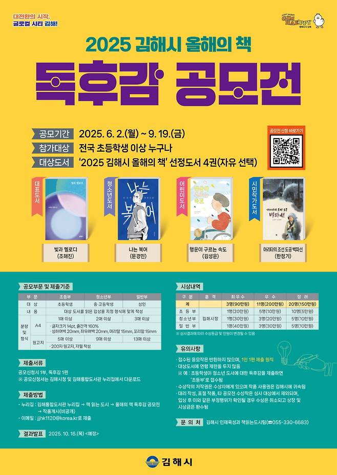 김해시가 책 읽는 문화를 확산하고자 6월2일부터 9월19일까지 '2025 김해시 올해의 책' 독후감 공모전을 연다.