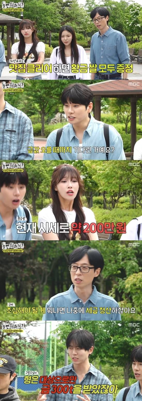 유재석은 "그 사이에 금값이 어마어마하게 올랐다. 이거 조심해야 한다. 나중에 연말에 세금 정산할 때 아무리 생각해도 어디서 받은 건지 (기억을 못 한다). (나도) 한참을 뒤졌다. 금도 나중에 받으시면 세금 정산하실 때 (확인해야 한다)"고 답했다.