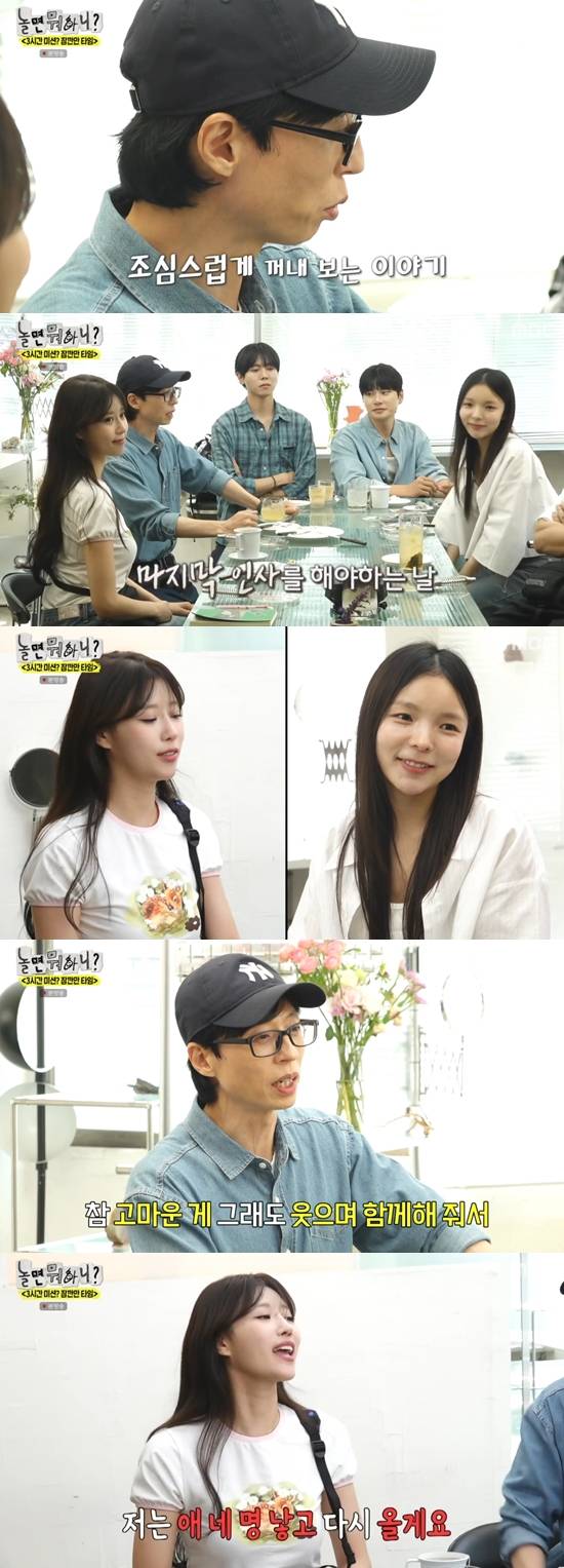 유재석은 "우리가 웃으면서 하루를 녹화 했지만 오랫동안 '놀면 뭐하니'를 함께했던 진주와 미주가 마지막 인사를 하는 날이다. 사실 저희와 제작진이 걱정 많이 했다. 정말 고맙게 웃으면서 티도 안 내고 녹화를 했다"고 밝혔다.