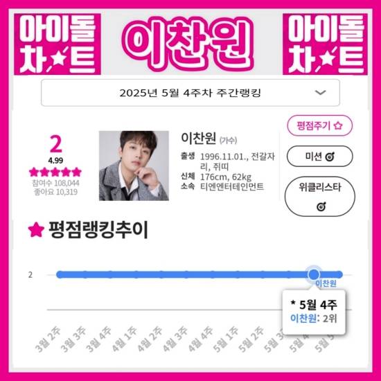 최근 아이돌차트는 이찬원이 5월 4주 차 평점 랭킹에서 108,044표를 받아 2위에 올랐다고 밝혔다.