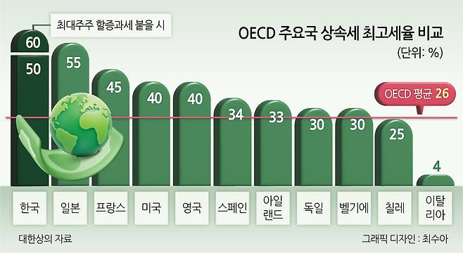 현행법에 따르면 우리나라 상속세 최고세율은 50%이다. 매출 5000억원이 넘는 기업의 최대주주가 상속할 경우 20% 할증이 붙어 60%까지 상승한다. 경제협력개발기구(OECD) 국가들의 평균 상속세 최고세율(26%)보다 30%포인트 이상 높다. 최대주주 보유 주식의 지분율과 관계없이 일괄적으로 상속세를 가산 부과하는 나라는 한국이 유일하다.