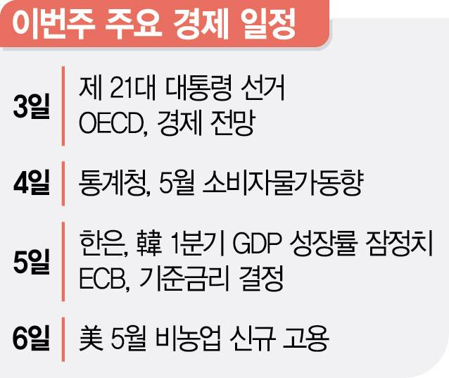 이번 주에는 3일 대통령 선거 후 차기 대통령이 경제정책과 관련해 어떤 일성을 내놓을지 주목된다. 한국은행이 올해 우리나라 경제성장률 전망치를 0%대로 낮춘 만큼 새 정부는 집권 초기부터 경기 부양에 적극적으로 나설 가능성이 크다. 이재명 더불어민주당 대선 후보와 김문수 국민의힘 대선 후보 모두 35조 원대 추가경정예산을 예고해 누가 당선되든 추경 편성이 본격화할 것으로 보인다. 대통령이 취임식에서 추경의 구체적 규모와 방향을 언급할지도 관심사다.