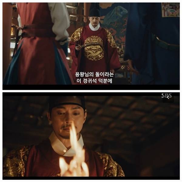윤갑은 이정(김지훈 분)을 향해서도 무릎을 꿇고 “전하께 내린 명을 지키지 못했다”며 사죄했고, 이정은 “내가 그토록 아끼던 윤갑이 돌아왔다”며 눈물을 글썽이며 포옹했다. 하지만 윤갑은 이정의 옥체에 닿자 고통을 느꼈고, 여리는 그 이유가 귀신을 쫓는 돌 ‘경귀석’ 때문이라고 설명했다.