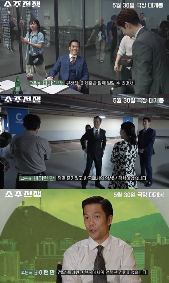 '소주전쟁'은 1997년 IMF 외환위기, 소주 회사가 곧 인생인 재무이사 종록(유해진 분)과 오로지 성과만 추구하는 글로벌 투자사 직원 인범(이제훈)이 대한민국 국민 소주의 운명을 걸고 맞서는 이야기를 담은 영화로, 바이런 만은 이 영화로 한국 영화에 처음 출연하게 됐다.