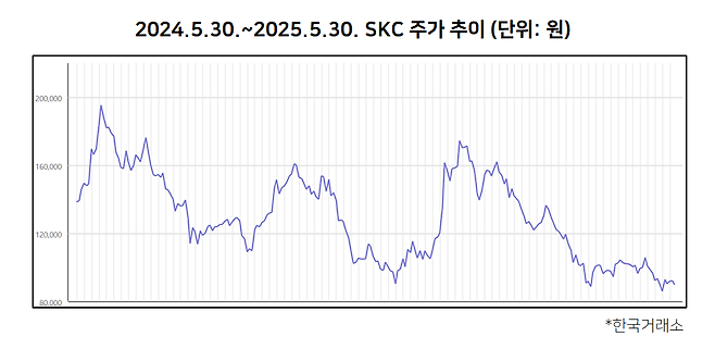 1일 한국거래소에 따르면 직전 영업일 SKC 종가는 8만9100원으로 1년 사이 최저점 수준에 머물러 있다. 종가 기준 52주 최고가 19만5300원과 비교하면 54% 하락한 수치다.