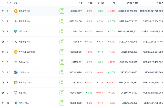 비트코인 10만4천달러 유지…도지코인 14% 급락, 솔라나는 11% 밀려