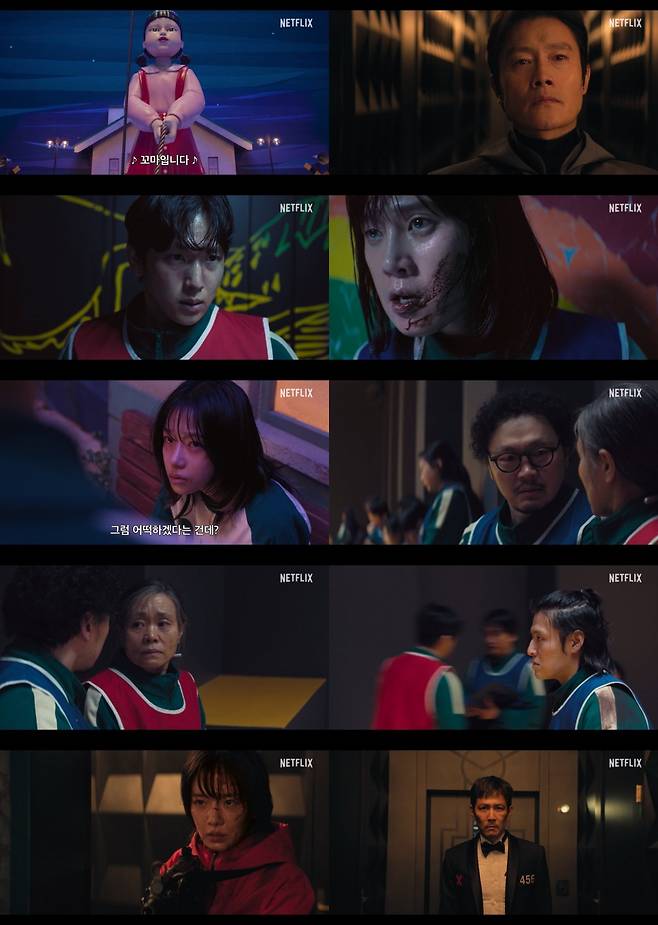 보도스틸도 함께 공개됐다. 끝나지 않은 ‘오징어 게임’ 속, 살아남기 위해 고군분투하는 참가자들의 모습을 담아내며 이목을 집중시킨다. 먼저 정장을 입은 채 누군가를 날카롭게 바라보는 ‘기훈’의 모습은 그가 게임을 완전히 무너뜨릴 수 있을 것인지 궁금증을 자아낸다. 132번 번호를 단 정장을 입은 ‘프론트맨’의 모습은 그의 새로운 서사에 대한 호기심을 자극한다.