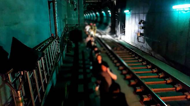 ▲ 31일 오전 8시 47분께 서울 지하철 5호선 여의나루역∼마포역 사이 지하철에서 방화 추정 화재가 발생해 승객들이 대피하고 있다.
